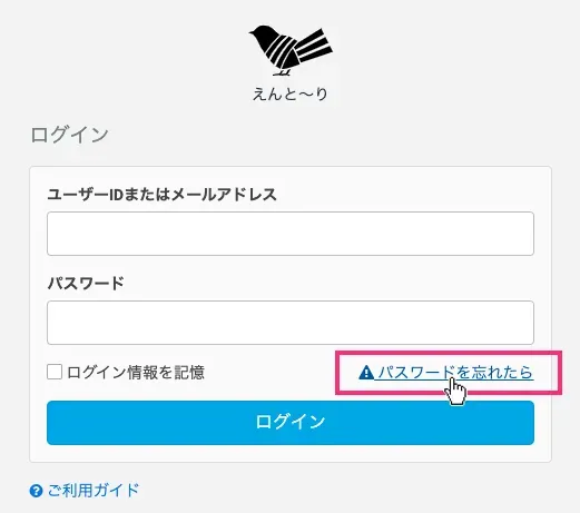 Section titled “5. 再設定の完了”新しいパスワードが設定されます。 そのままえんと〜りのご利用を開始するには、【引き続きえんと〜りを利用する】ボタンを押してください。 一旦終了する場合は【終了する】ボタンを押してログアウトしてください。