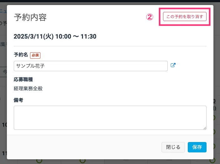Section titled “面接の予約状況を確認・予約を取り消す方法”管理画面からの予約取り消し方法については、エントリー者詳細画面からと、カレンダー画面からの2つの方法があります。