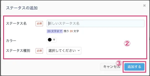 - ステータス追加の画面が開きますので、新しいステータスを入力してください。